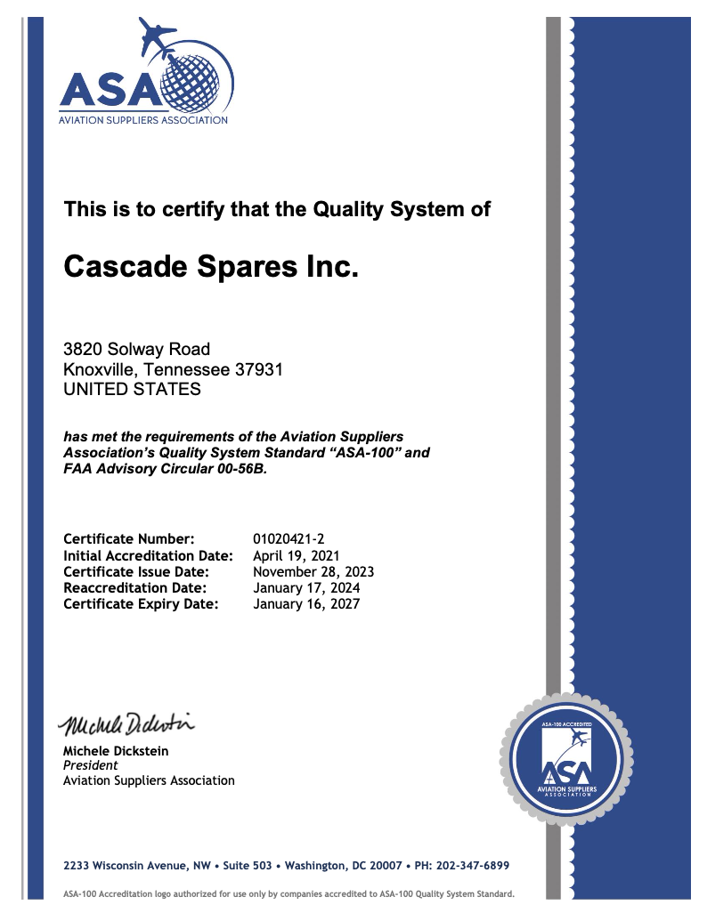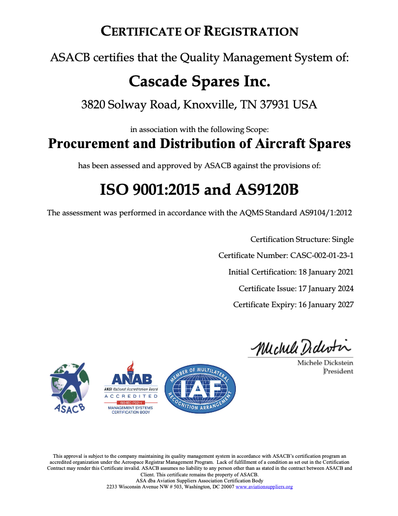 At Cascade Spares, we pride ourselves on our ability to respond quickly to your needs, but that doesn't mean we sacrifice in terms of quality. In fact, we are committed to adhering to the highest industry standards in making sure our aviation components meet or exceed all internal and external requirements so we can ensure accuracy, quality and proper documentation. In addition, Cascade Spares maintains a focus on continuous improvement of our Quality Management System.